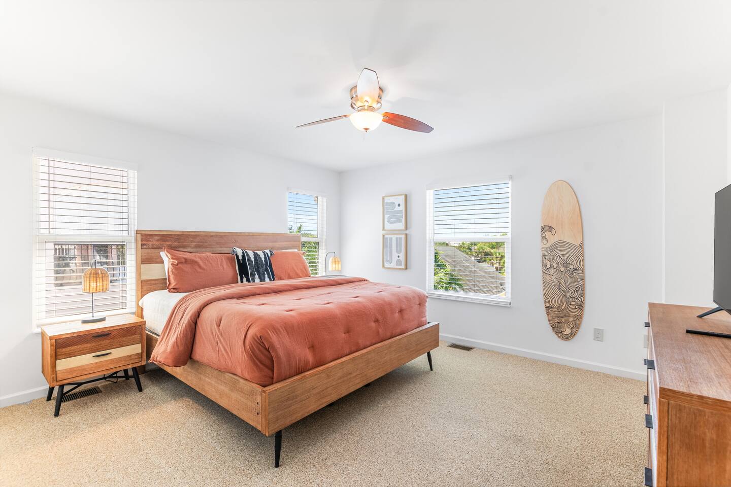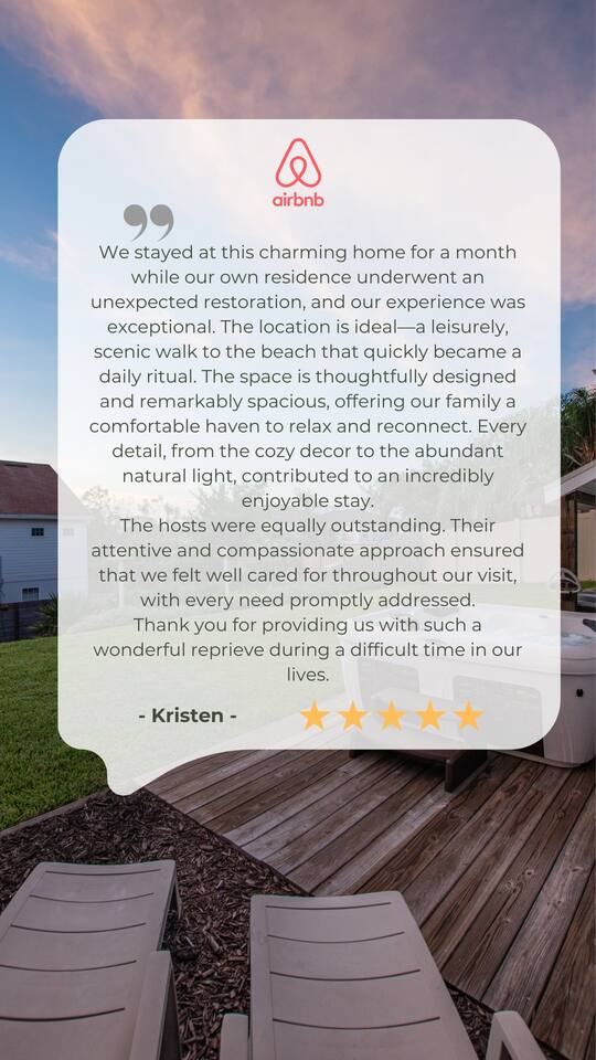 Just 500 feet from the sand, this spacious 3,080 sq. ft. home is built for gathering. With 5 bedrooms—including a private in-law suite—and space to comfortably host up to 18 guests, it's the perfect fit for large families, multi-generational vacations, or groups of friends looking for a true coastal retreat. Inside, you’ll find thoughtfully designed living areas, a full kitchen, and all the room you need to spread out and relax. Outside, enjoy a private backyard with a hot tub, outdoor seating, and easy beach access that makes sunrise strolls and sunset hangs part of your daily routine. Set in the heart of Florida’s oldest city, this home blends comfort, space, and location to create a beach getaway your group will talk about long after checkout. ---Highlights of Your Stay--- ▪️Relaxing Master Oasis: The third-story master suite is a true retreat with breathtaking ocean views from a private balcony, a luxurious king bed, and a massive walk-in closet. Get active in the additional room equipped with free weights, yoga mats, full-length mirrors, and a desk—perfect for a workout or a peaceful workspace. ▪️Private Mother-in-Law Suite: Enjoy complete privacy in the ground-level suite, featuring its own bedroom, full bathroom, living room, and kitchenette with essentials like a fridge, microwave, sink, coffee station, toaster, Smart TV and additional sofa bed. It’s an ideal spot for extended family or group members who enjoy a little extra space. ▪️Perfectly Designed Common Areas: The second-story living space, flooded with natural light and vaulted ceilings, brings comfort and connection to your stay. Relax on the inviting sectional sofa, catch your favorite shows on the Smart TV, or challenge your group to a game night with the provided board games. The fully equipped kitchen is built for famous family recipes, with island seating for 3 and a large dining table for 8—perfect for sharing stories and savoring delicious dishes after a day in the sun. ▪️Bedrooms Built for Everyone’s Comfort: Bedroom 1: King bed (Sleeps 2) Bedroom 2: King bed (Sleeps 2) Bedroom 3: Four Queen beds (Sleeps 8—perfect for the kids or friends!) Bedroom 4 (Master Suite): King bed (Sleeps 2) Bedroom 5 (Mother-in-Law Suite): Queen bed and sofa bed (Sleeps 4) ▪️Outdoor Spaces to Enjoy Sunrises and Starry Nights: Private Balcony with Ocean Views Step outside the master suite to enjoy your morning coffee on the balcony, complete with an outdoor table and chairs, while the ocean breeze sets the tone for your day. ▪️Pet-Friendly Backyard with Relaxation in Mind: Unwind in the fully fenced backyard, featuring sun loungers, a wood-burning fire pit for cozy evenings, a charcoal grill for beachside barbecues, and a bubbling hot tub for ultimate relaxation. ▪️Extras for Fun-Filled Days: Make the most of your beach vacation with easy access to bikes (6 provided), a stroller, and a selection of beach essentials, including a sand wagon, chairs, umbrella, boogie boards, and skimboards. The outdoor shower ensures you can rinse off and head straight to relaxation. ▪️Where Coastal Comfort Meets Convenience: Tailored for families and groups, The Pelican beach house blends stunning ocean views, inviting spaces, and thoughtful amenities to create a stay that everyone will remember. Whether it’s mornings on the balcony, afternoons on the beach, or cozy evenings around the fire pit, this retreat has been meticulously designed to meet your every need. ---Distance To--- • Butler Beach Access: 500 Ft • Crescent Beach Park: 1.9 Miles • Green Road Boat Ramp: 2.4 Miles (Paddle Board and Kayak Launch) •St. Augustine Beach: 4.3 Miles • Fort Matanzas National Monument: 5.5 Miles • St. Augustine Amphitheater 6.1 Miles • St. Augustine Lighthouse: 6.7 Miles • St. Augustine Alligator Farm: 6.9 Miles • St. Augustine Historic District: 8.8 Miles • Daytona Beach Int Airport: 51.6 Miles • Jacksonville Int Airport: 68 Miles Grocery Stores: • Winn-Dixie: 2.5 Miles • Publix: 2.7 Miles • Aldi: 8 Miles ATTENTION TO DETAIL ✔ Cleanliness is a top priority for us and we pride ourselves on welcoming you into a sparkling clean home. ✔ Our home has a washer and dryer along with ironing board and iron for your use in laundry room. ✔We keep a first aid kit onsite. ✔Fire extinguisher is kept in laundry room. ✔ We provide fresh premium linens for each guest. ✔ We provide starter (2 nights) paper goods and consumables - paper towels, tissues, toilet paper, laundry soap, dishwasher tablets, dish soap, sponges. ✔ Coffee included