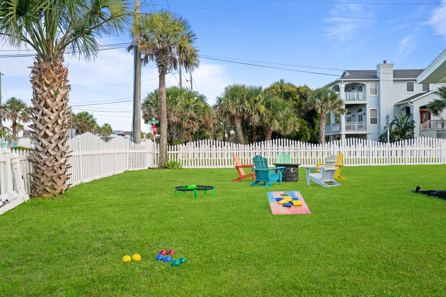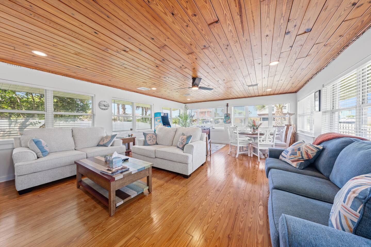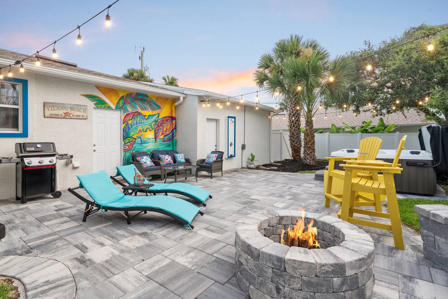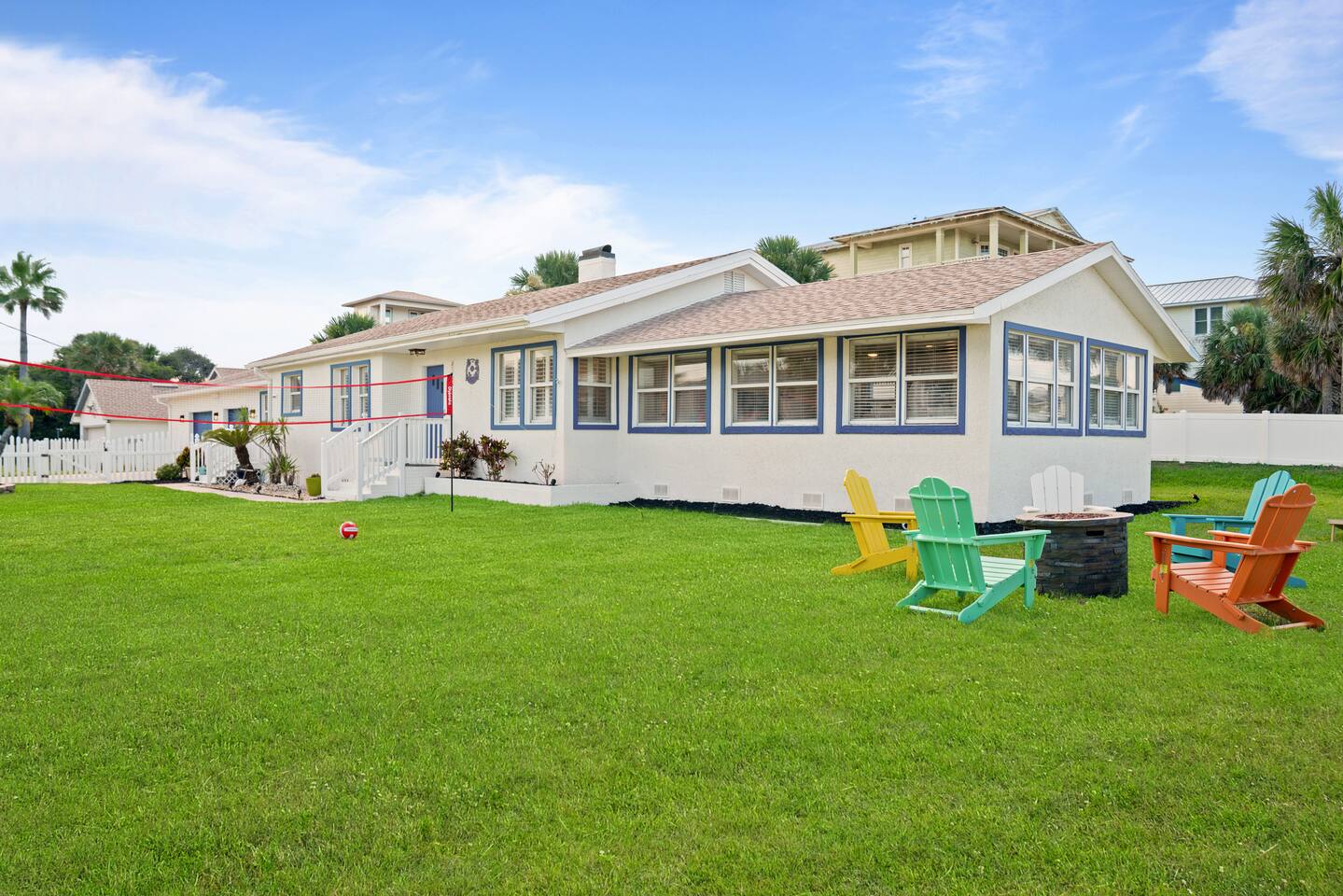 Welcome to your coastal corner escape—where flip-flops are mandatory, the vibes are laid-back, and the beach is walking distance. This family-friendly retreat sits on a spacious corner lot in the heart of Vilano Beach, offering the perfect mix of fun, comfort, and relaxation. Whether you're lounging in the 7-seater hot tub, roasting marshmallows by the fire, or heading out with boogie boards in hand, this home is made for memory-making. ▪️Inside the Retreat▪️ Living & Game Room: 🛏️ Open-concept with three sofas + queen pull-out sleeper 👾 Arcade machine & foosball table for nonstop fun 🍴Dining area for shared meals & board game nights 📺 Smart TV + high-speed WiFi Primary Suite: 🛏️ Oversized king bedroom with two closets 💄 Makeup vanity & cozy reading corner 📺 Smart TV + en suite bath with shower 👶 Kids Pack N' Play Guest Bedrooms & Baths: 🛏️ Guest Room 1: Two queen beds + lots of natural light 🛏️ Guest Room 2: Private king suite with desk + yard access 🚽1/2 Bathroom for guests 🛁 Full bathroom with detached soaking tub and walk in shower Kitchen & Dining List Includes: 1. Toaster 2. Kettle 3. Keurig and Milk Frother 4. Complete set of ceramic cookware set - pots, pans, frying pans 5. Cooking Utensils 6. Mixing bowls 7. Salad Bowl 8. Baking trays, muffin pans 9. Pizza tray for the oven (16 inches) 10. Blender 11. Instant Pot that can be a rice cooker, a pressure cooker, and an air fryer 12. Basic spices and olive oil 13. Grill utensils and a meat thermometer 14. Oven Mitts 15. Knife Set and cutting board ▪️Outdoor Paradise▪️ 😎 7 seater hot tub with massage jets 🔥 Two fire pits (propane + wood) with seating 🚿 Outdoor shower for rinsing off the sand 🏐 Volleyball net, bocce ball, corn hole & lawn games 🌊 Boogie boards for beach day adventures 🌞 Sun loungers + multiple seating areas 🐶Pet friendly ▪️Distance To▪️ Our home places you at the heart of Vilano Beach, with excellent access to some of the area's best attractions and amenities... 🔹<0.1 mi to Vilano Beach & Surfside Park 🔹<0.1 mi to pickleball, tennis & basketball courts 🔹0.6 mi to Publix & local restaurants 🔹0.9 mi to Vilano Pier + water view dining 🔹2.3 mi to aunt Kates dining 🔹2.8 mi to caps on the water dining 🔹3.1 mi to Historic Downtown St. Augustine 🔹5.4 mi to alligator farm 🔹5.8 mi to Anastasia State Park 🔹5.8 mi to St. Augustine Lighthouse 🔹8.7 mi to St. Augustine Beach ✈️51.9 mi to Jacksonville International Airport ATTENTION TO DETAIL ✔ Cleanliness is a top priority for us and we pride ourselves on welcoming you into a sparkling clean home. ✔ Our home has a washer and dryer along with ironing board and iron for your use. No detergent or dryer sheets included due to skin sensitivity. Guests must buy their own. ✔We keep a first aid kit in the primary bathroom for minor cuts and scrapes. ✔ We provide fresh premium linens for each guest. ✔ We provide basic paper goods and consumables to last 2 days - paper towels, tissues, toilet paper, dishwasher tablets, dish soap, sponges. ✔ Coffee & tea are included. Additonal Items: We do welcome dogs! Other pets will not be considered due to allergies. Must make a pet apart of your reservation for the fee to be applied. ($125.00/dog)